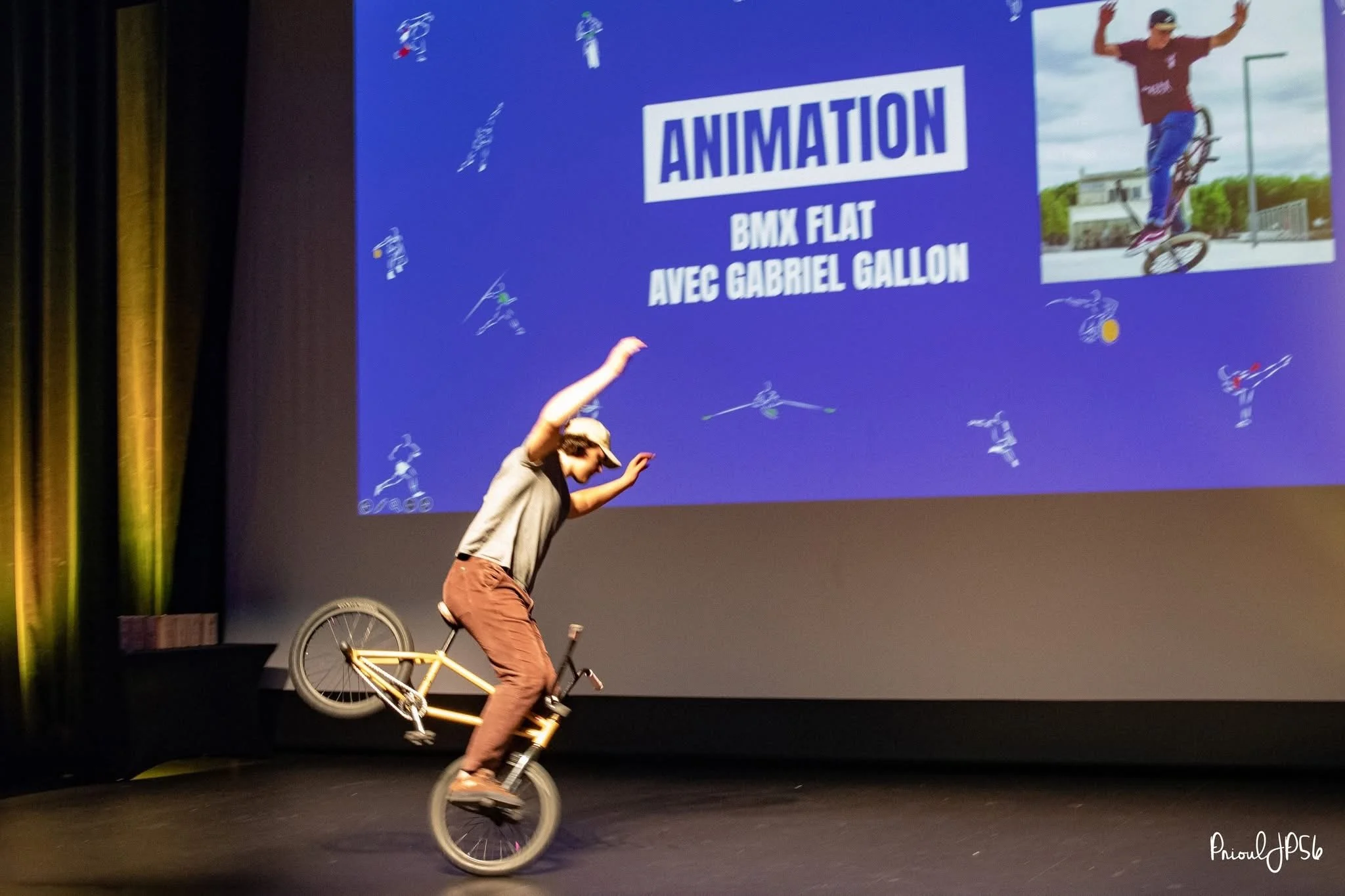 Durant une dizaine de minutes, j’ai présenté les bases techniques, la créativité et l’intensité du BMX flatland, une discipline encore méconnue du grand public mais qui séduit par son mélange d’équilibre, de maîtrise et d’expression artistique. Réaliser ce type de performance sur scène, en intérieur, dans un lieu culturel comme le Palais des Arts, est toujours un défi technique et visuel.